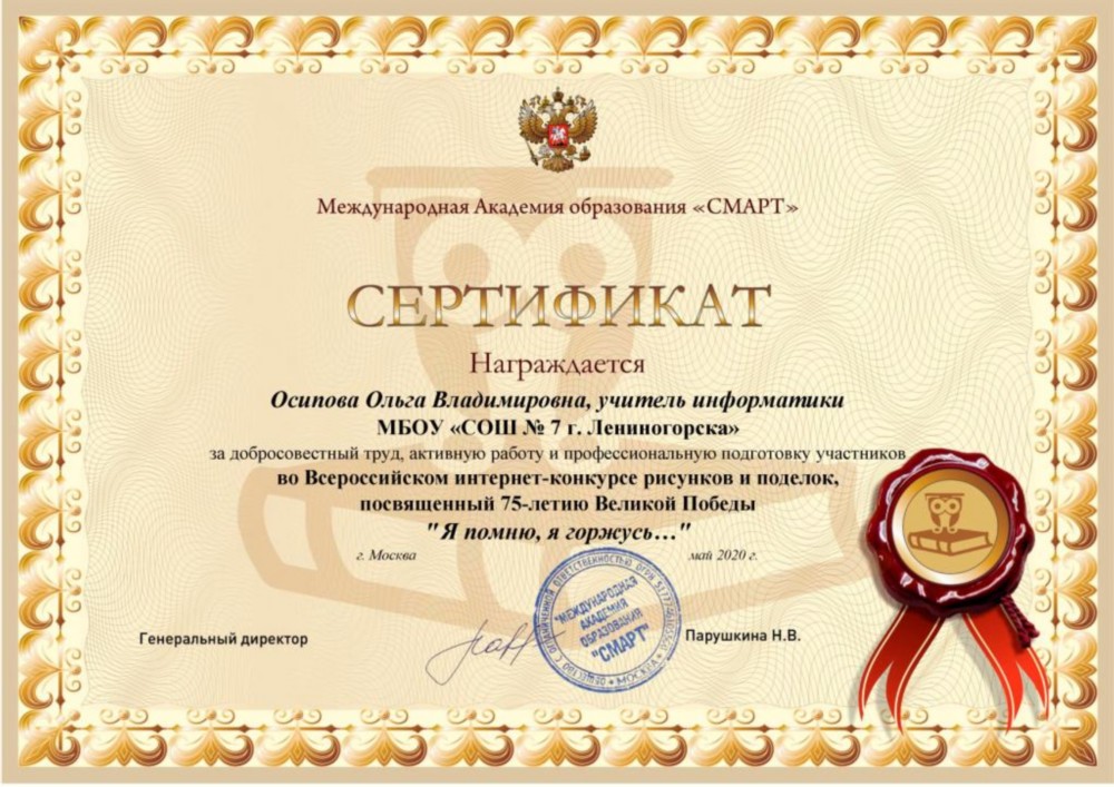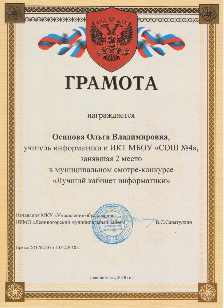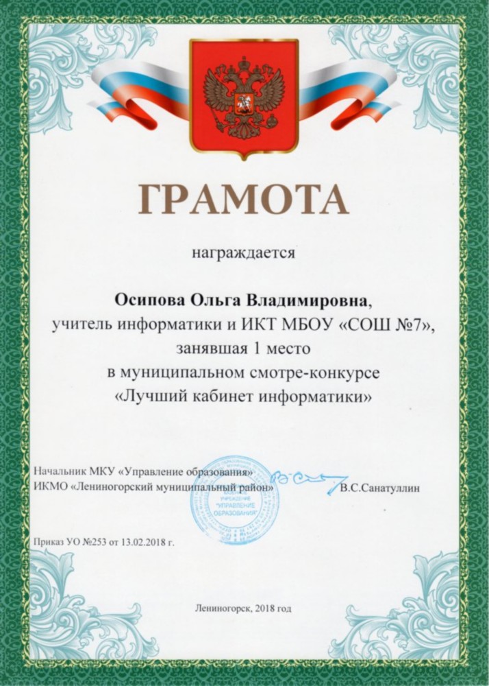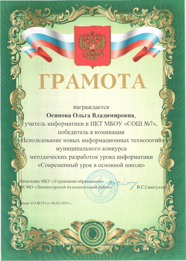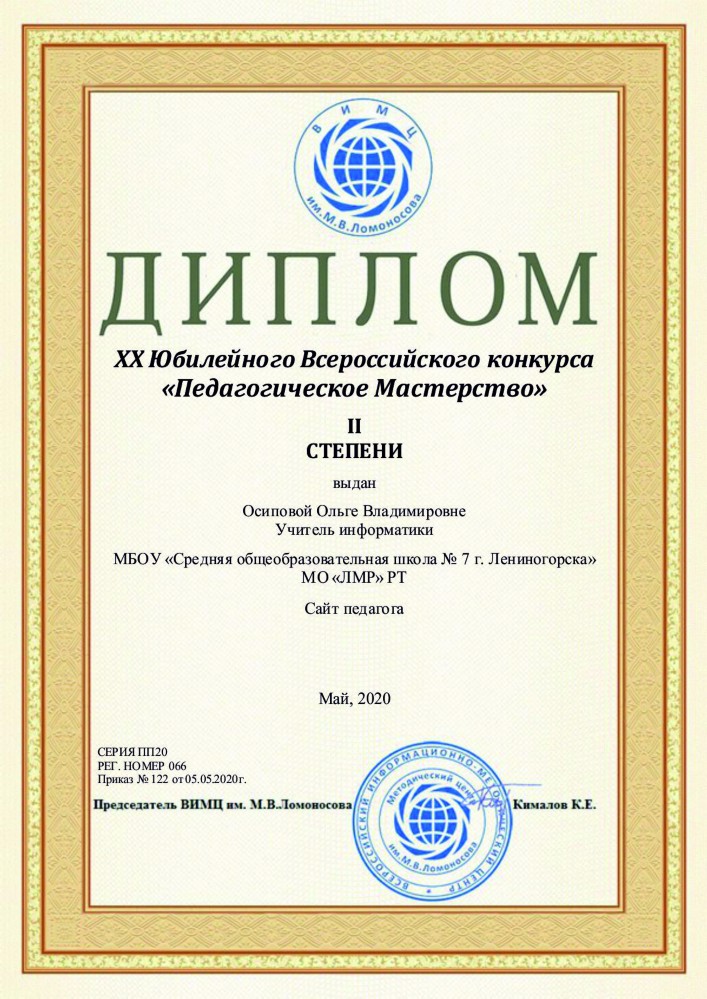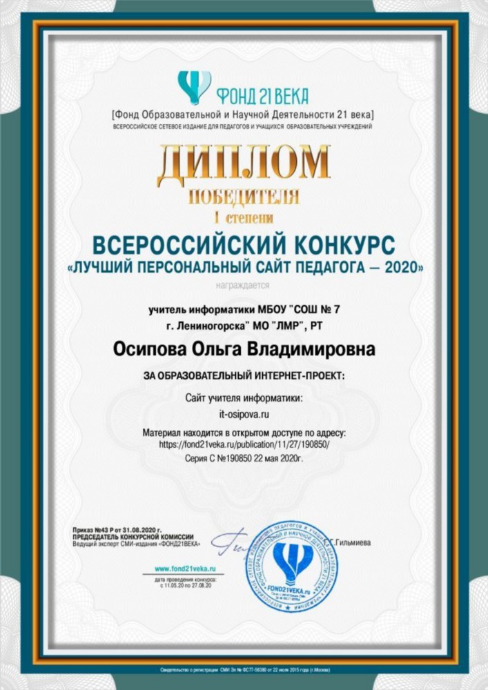 Приказ об итогах муниципального конкурса «Лучший персональный сайт учителя», 2020.