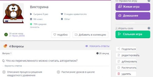 выбирать викторины других пользователей и проводить их для своих учащихся.